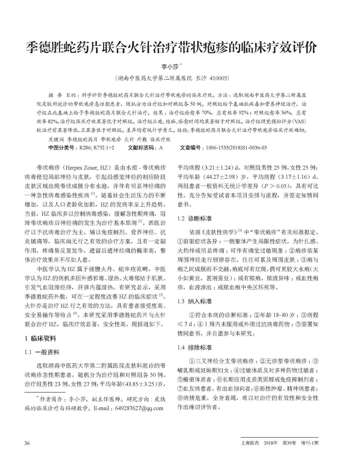本研究观察季德胜蛇药片联合火针治疗带状疱疹的临床疗效。对照组给予基础抗病毒和营养神经治疗,治疗组在对照组治疗基础上同时给予季德胜蛇药片外敷联合火针点刺治疗。治疗10天。结果显示:治疗组临床疗效显著优于对照组;治疗组止疱、结痂、痊愈时间均显著短于对照组;治疗组疼痛评分较治疗前显著降低,且显著低于对照组。结果表明季德胜蛇药片联合火针治疗带状疱疹疗效确切,皮肤愈合快,能明显降低后遗症。