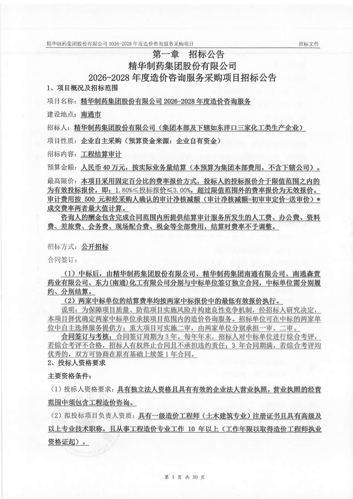 附件:精华制药集团股份有限公司造价咨询服务采购项目招标文件(2026-2028年)